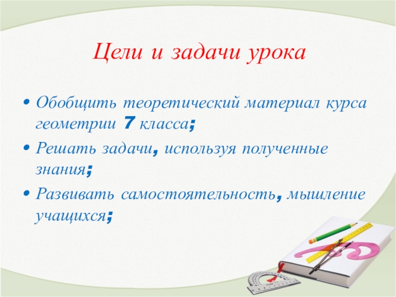 Цели и задачи урокаОбобщить теоретический материал курса геометрии 7 класса;Решать задачи, используя полученные знания;Развивать самостоятельность, мышление учащихся;