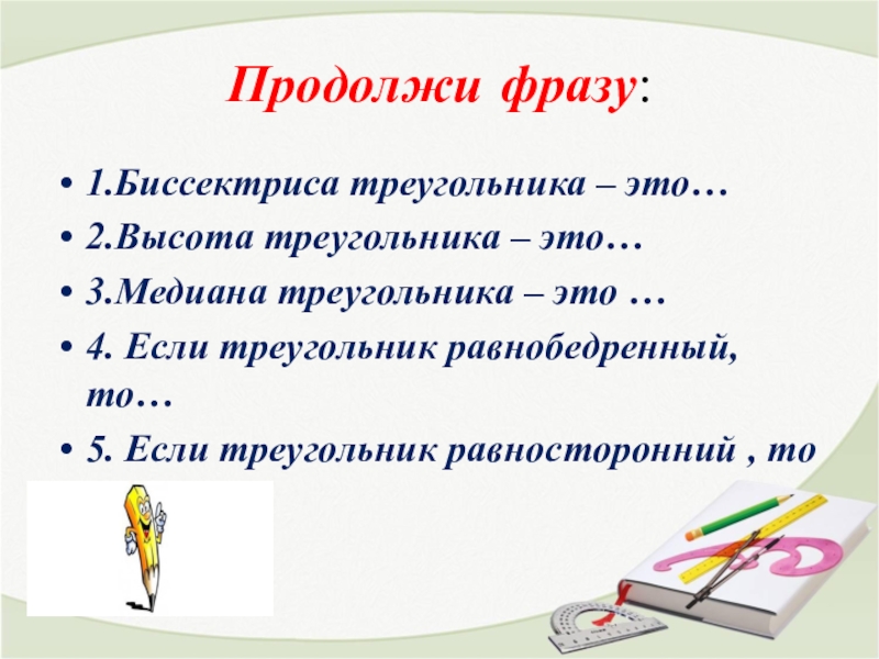Продолжи фразу:1.Биссектриса треугольника – это…2.Высота треугольника – это…3.Медиана треугольника – это …4. Если треугольник равнобедренный, то…5. Если