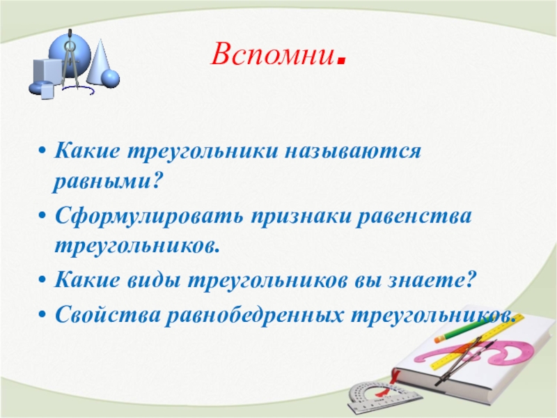 Вспомни.Какие треугольники называются равными?Сформулировать признаки равенства треугольников.Какие виды треугольников вы знаете?Свойства равнобедренных треугольников.