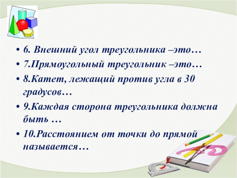 6. Внешний угол треугольника –это…7.Прямоугольный треугольник –это…8.Катет, лежащий против угла в 30 градусов…9.Каждая сторона треугольника должна быть