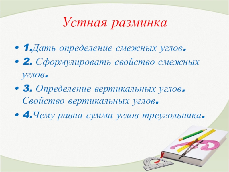 Устная разминка1.Дать определение смежных углов.2. Сформулировать свойство смежных углов.3. Определение вертикальных углов. Свойство вертикальных углов.4.Чему равна сумма