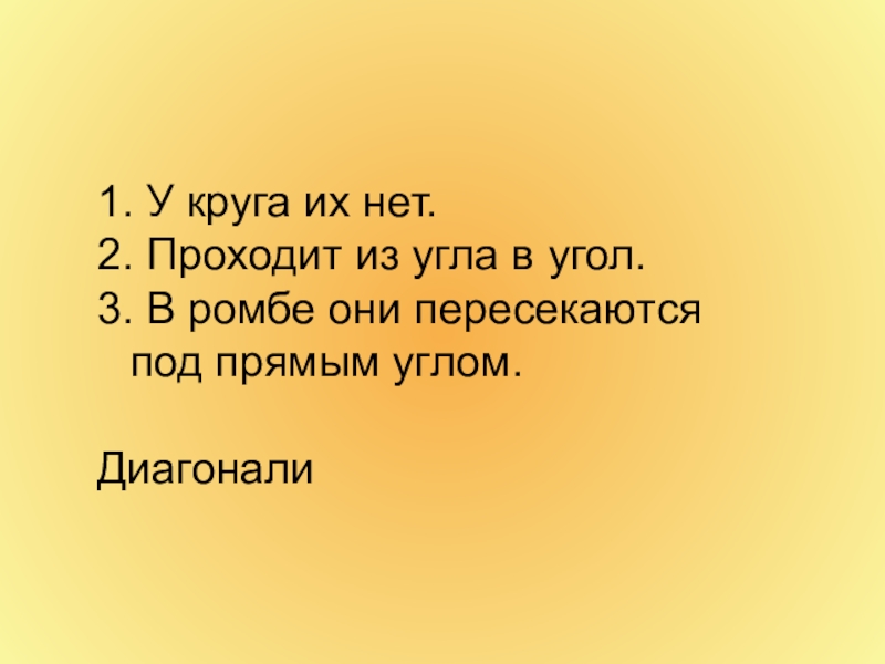 1. У круга их нет. 2. Проходит из угла в угол. 3. В ромбе они пересекаются под прямым углом.