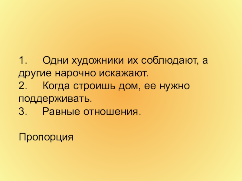 1.     Одни художники их соблюдают, а другие нарочно искажают. 2.     Когда строишь дом, ее нужно поддерживать. 3.