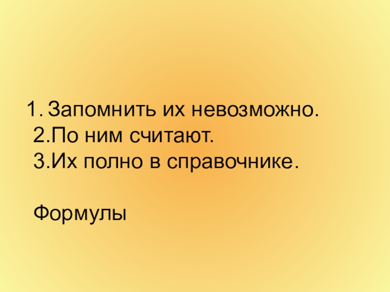 Запомнить их невозможно. 2.По ним считают. 3.Их полно в справочнике. Формулы