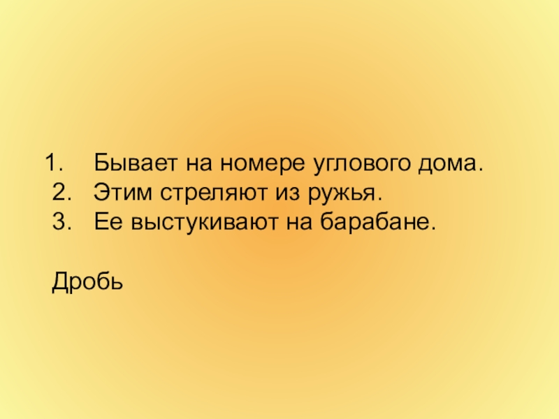 Бывает на номере углового дома. 2.   Этим стреляют из ружья. 3.   Ее выстукивают на барабане. Дробь