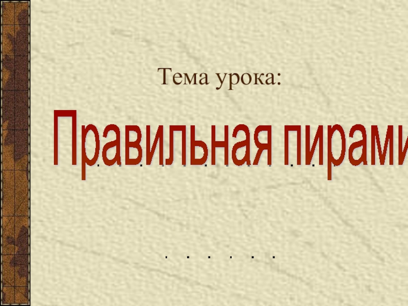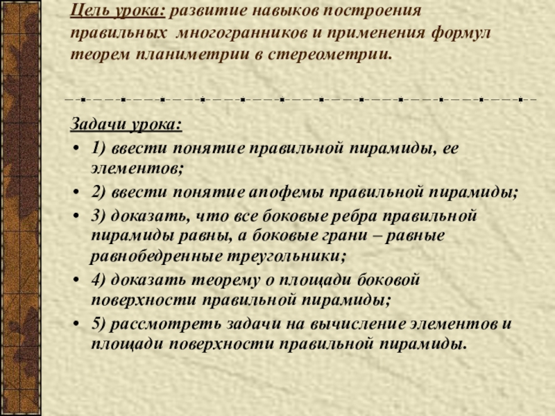 5) рассмотреть задачи на вычисление элементов и площади поверхности правильной пирамиды.