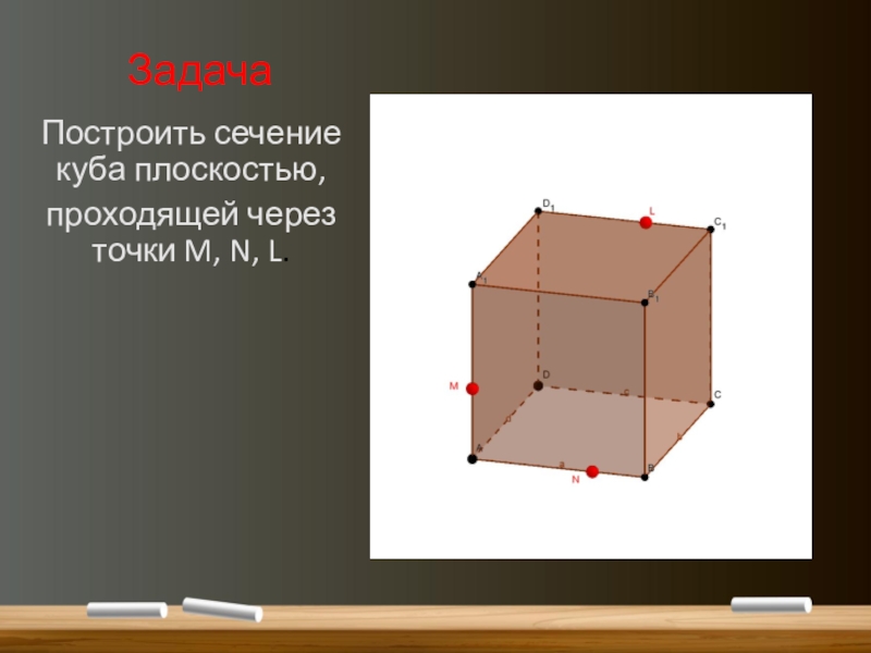 ЗадачаПостроить сечение куба плоскостью,проходящей через точки M, N, L.