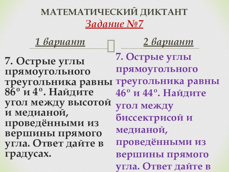 7. Острые углы прямоугольного треугольника равны 46º и 44º. Найдите угол между биссектрисой и медианой, проведёнными из вершины прямого угла. Ответ дайте в градусах.