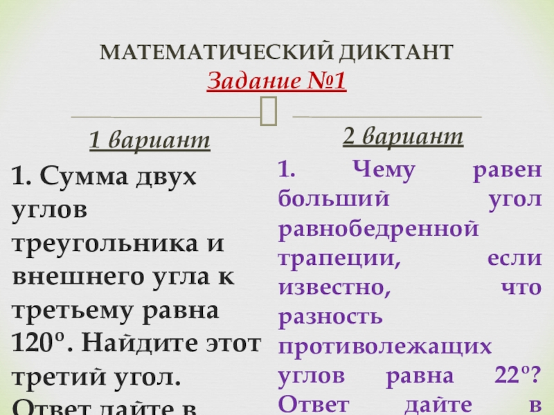 1. Чему равен больший угол равнобедренной трапеции, если известно, что разность противолежащих углов равна 22º? Ответ дайте в градусах.
