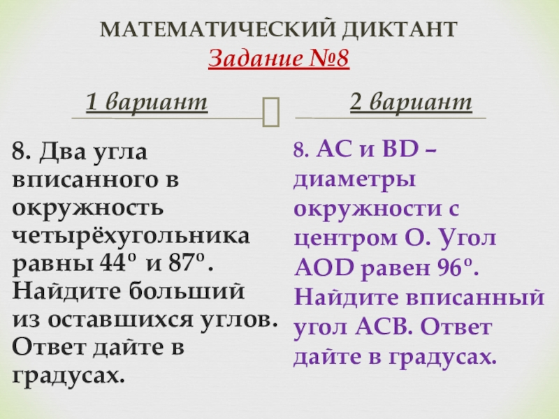 8. АС и ВD – диаметры окружности с центром О. Угол АОD равен 96º. Найдите вписанный угол АСВ. Ответ дайте в градусах.