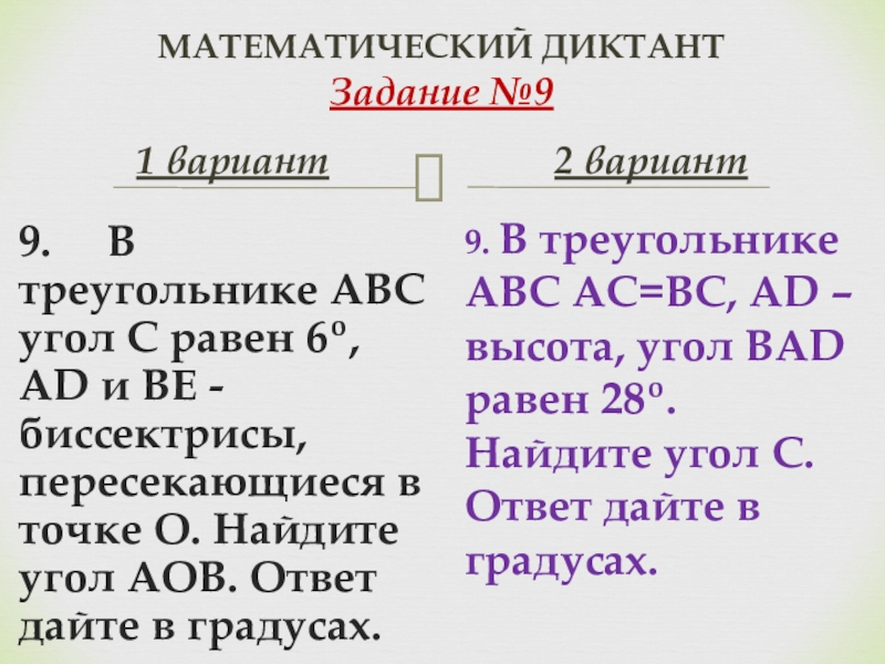 9. В треугольнике АВС АС=ВС, АD – высота, угол BAD равен 28º. Найдите угол С. Ответ дайте в градусах.