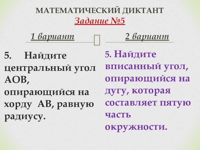 5. Найдите вписанный угол, опирающийся на дугу, которая составляет пятую часть окружности.
