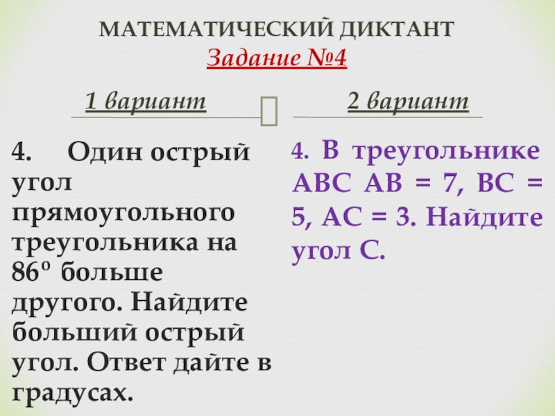 4. В треугольнике ABC AB = 7, BC = 5, AC = 3. Найдите угол C.