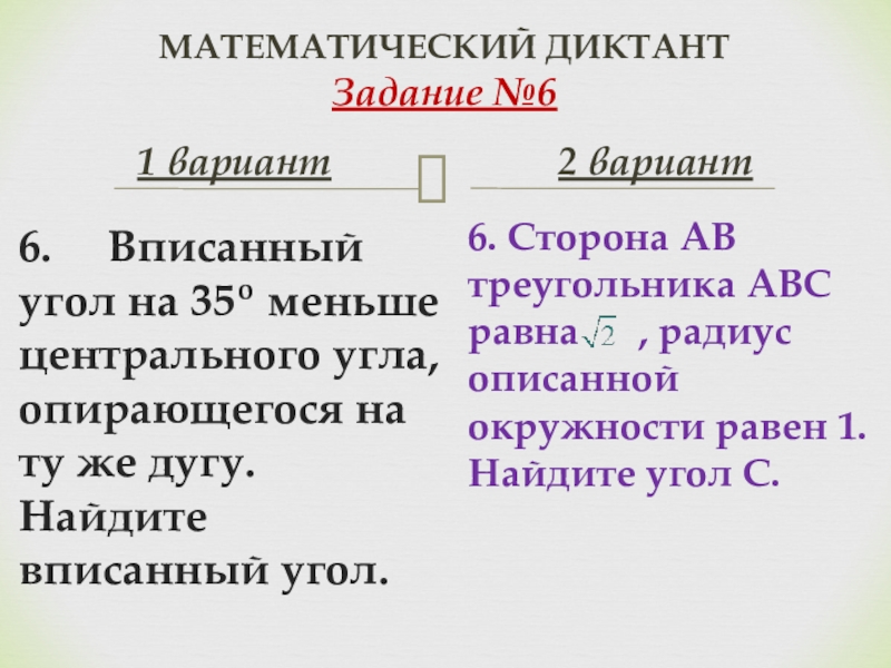 6. Сторона AB треугольника ABC равна , радиус описанной окружности равен 1. Найдите угол C.