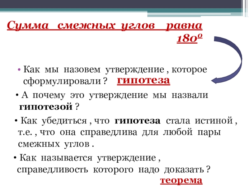 Как убедиться , что гипотеза стала истиной , т.е. , что она справедлива для любой пары смежных углов .