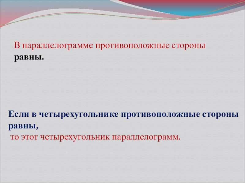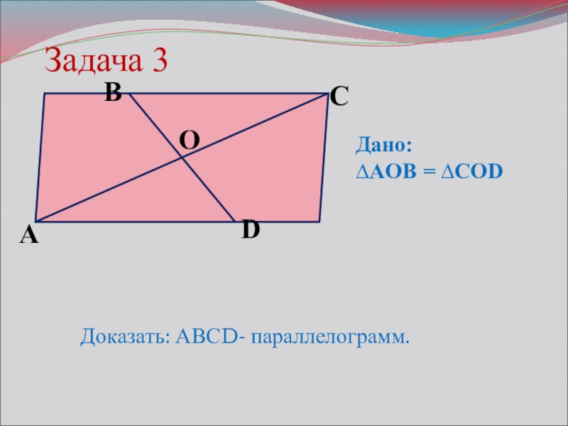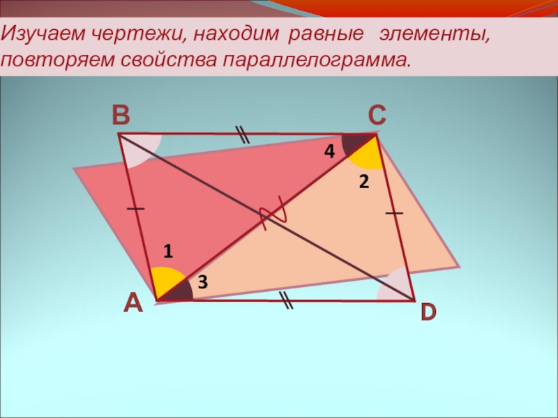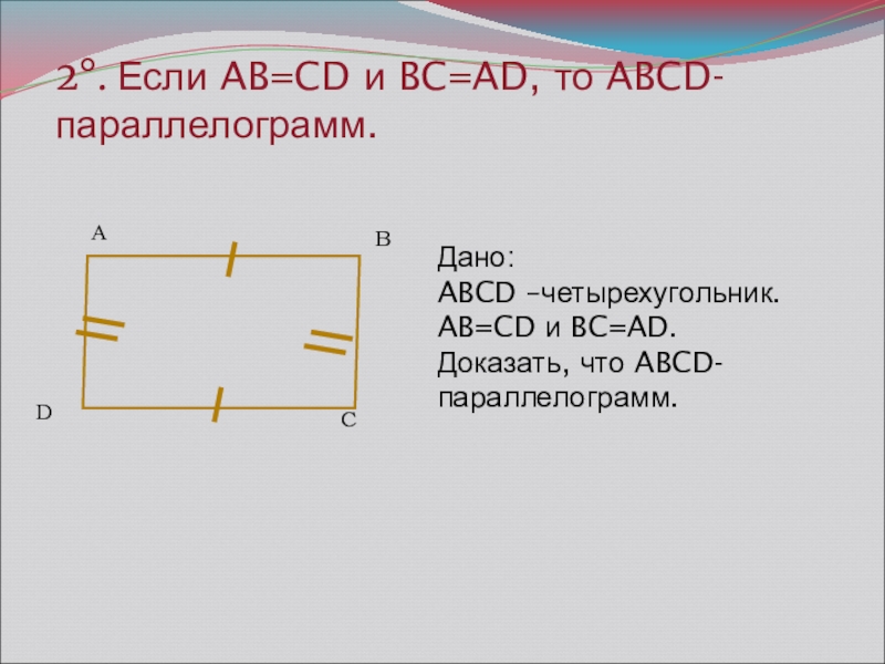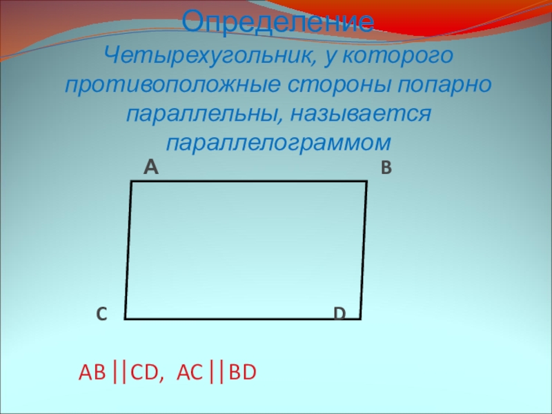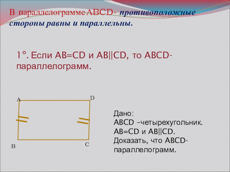 В параллелограмме АBCD- противоположные стороны равны и параллельны.
