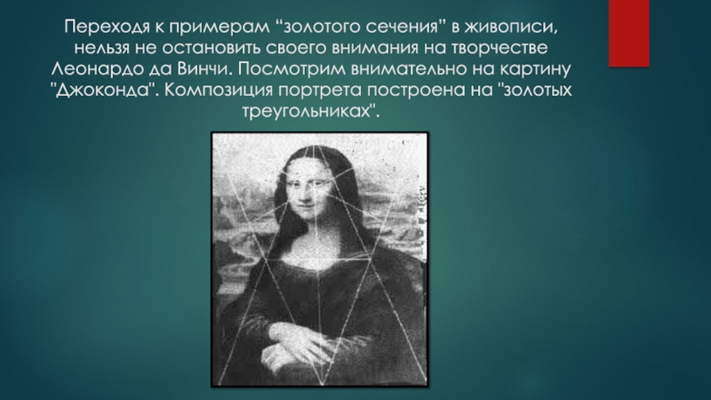 Слайд 8Переходя к примерам “золотого сечения” в живописи, нельзя не остановить своего