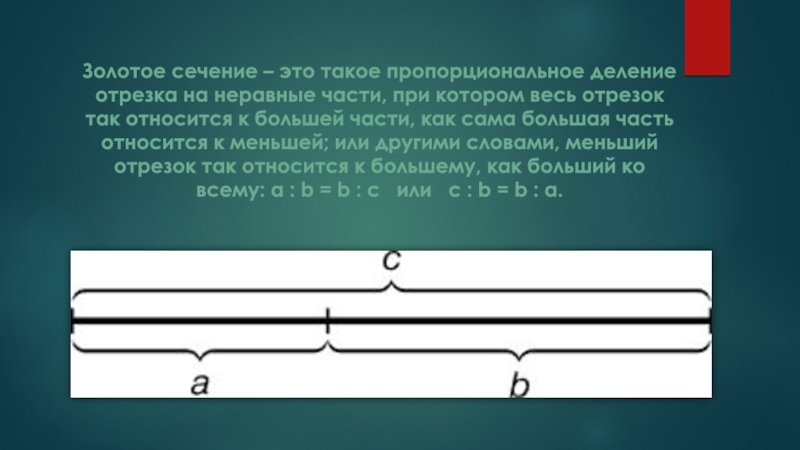 Слайд 3Золотое сечение – это такое пропорциональное деление отрезка на неравные части,