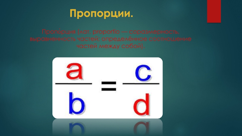 Пропорции.Пропо́рция (лат. proportio — соразмерность, выравненность частей; определённое соотношение частей между собой).