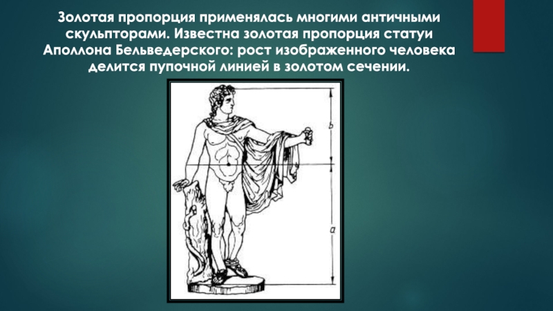 Слайд 7Золотая пропорция применялась многими античными скульпторами. Известна золотая пропорция статуи Аполлона
