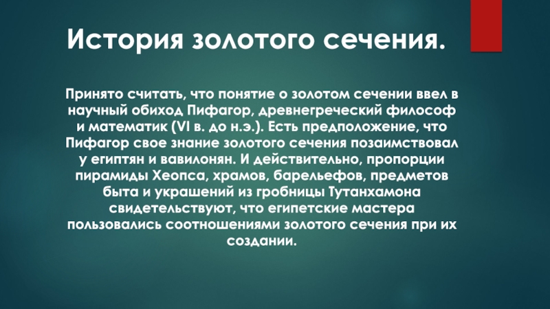 сечении ввел в научный обиход Пифагор, древнегреческий философ и математик (VI в. до н.э.). Есть предположение, что Пифагор свое знание золотого сечения позаимствовал у египтян и вавилонян. И действительно, пропорции пирамиды Хеопса, храмов, барельефов, предметов быта и украшений из гробницы Тутанхамона свидетельствуют, что египетские мастера пользовались соотношениями золотого сечения при их создании.