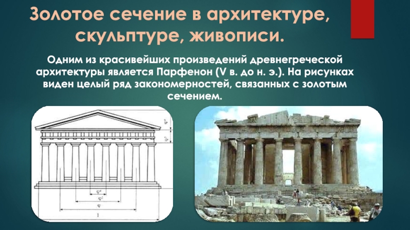 Слайд 5Золотое сечение в архитектуре, скульптуре, живописи.