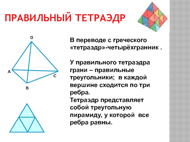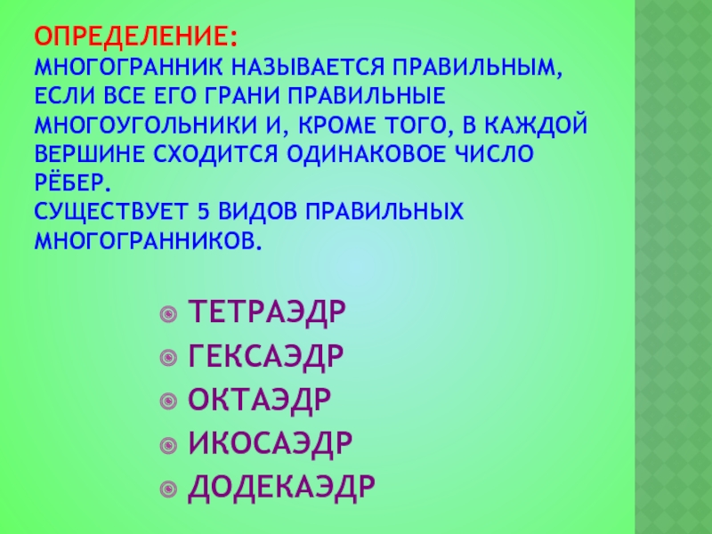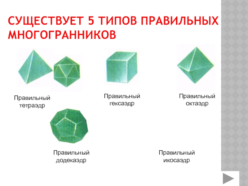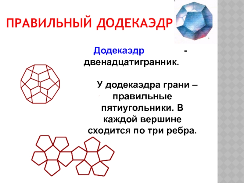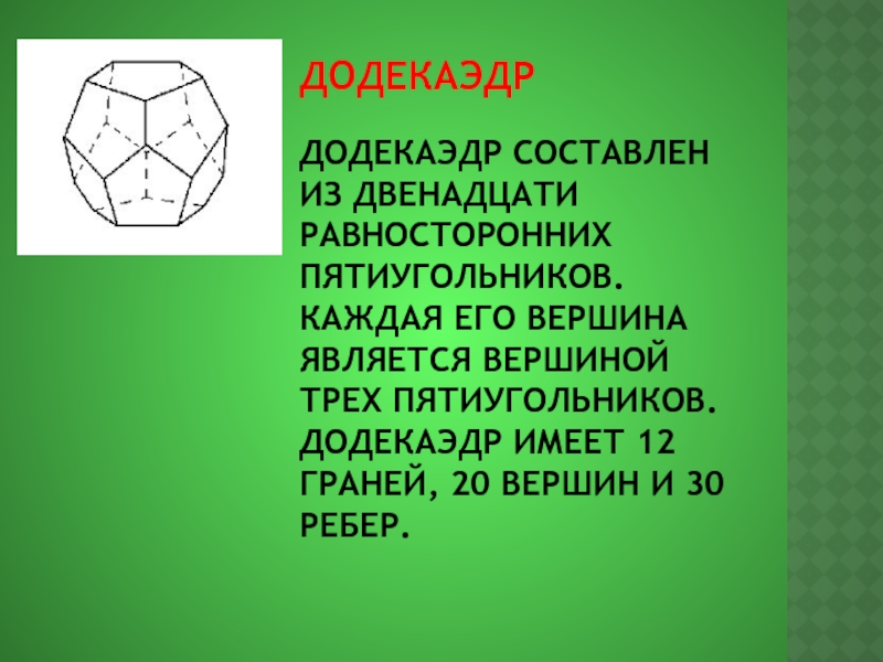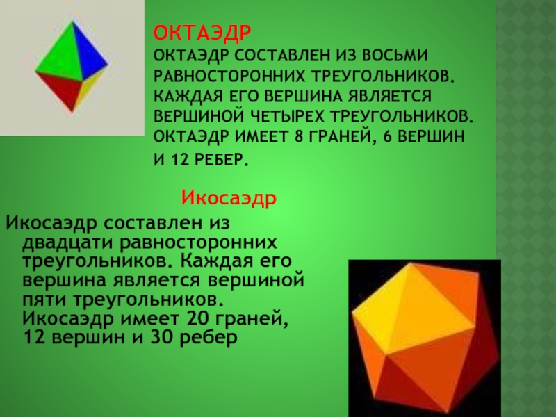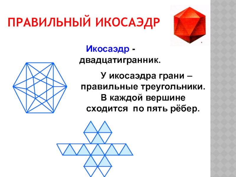 Икосаэдр составлен из двадцати равносторонних треугольников. Каждая его вершина является вершиной пяти треугольников. Икосаэдр имеет 20 граней, 12 вершин и 30 ребер