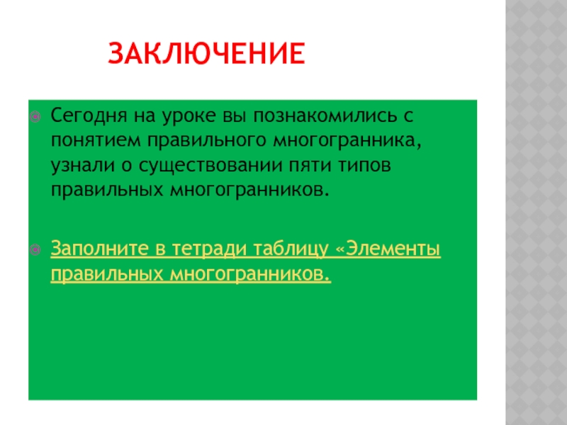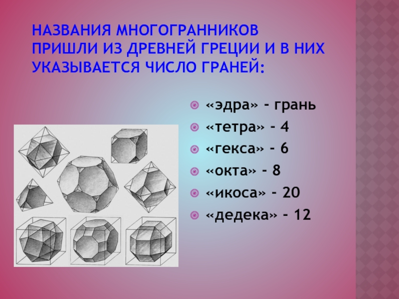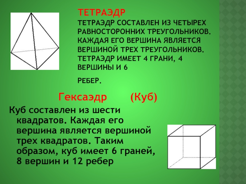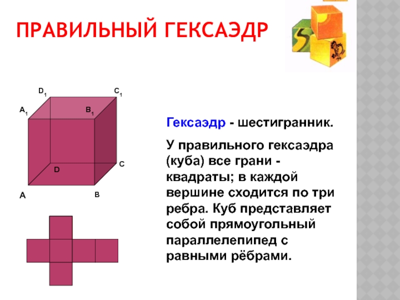 Куб составлен из шести квадратов. Каждая его вершина является вершиной трех квадратов. Таким образом, куб имеет 6 граней, 8 вершин и 12 ребер