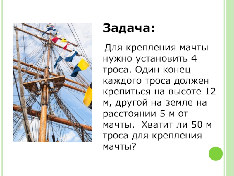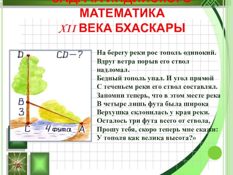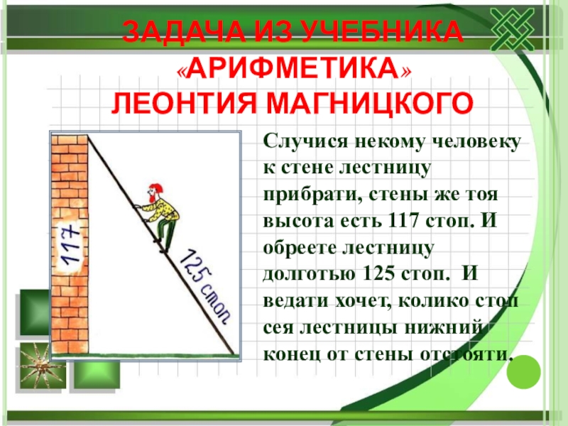 Случися некому человеку к стене лестницу прибрати, стены же тоя высота есть 117 стоп. И обреете лестницу долготью 125 стоп. И ведати хочет, колико стоп сея лестницы нижний конец от стены отстояти.