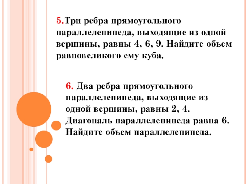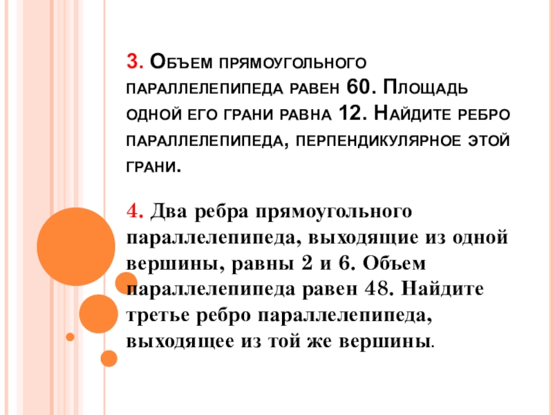 4. Два ребра прямоугольного параллелепипеда, выходящие из одной вершины, равны 2 и 6. Объем параллелепипеда равен 48. Найдите третье ребро параллелепипеда, выходящее из той же вершины.