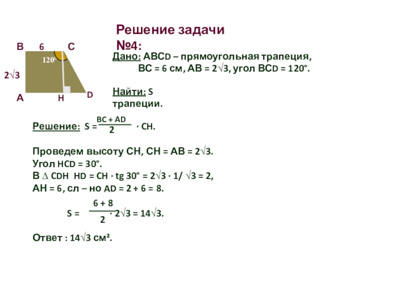 В ∆ CDH HD = CH · tg 30° = 2√3 · 1/ √3 = 2,