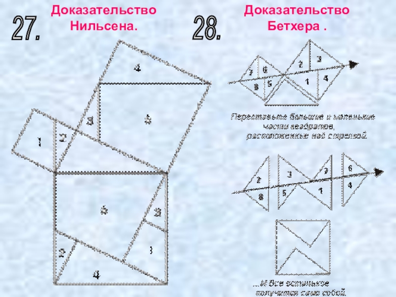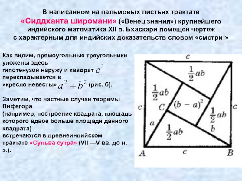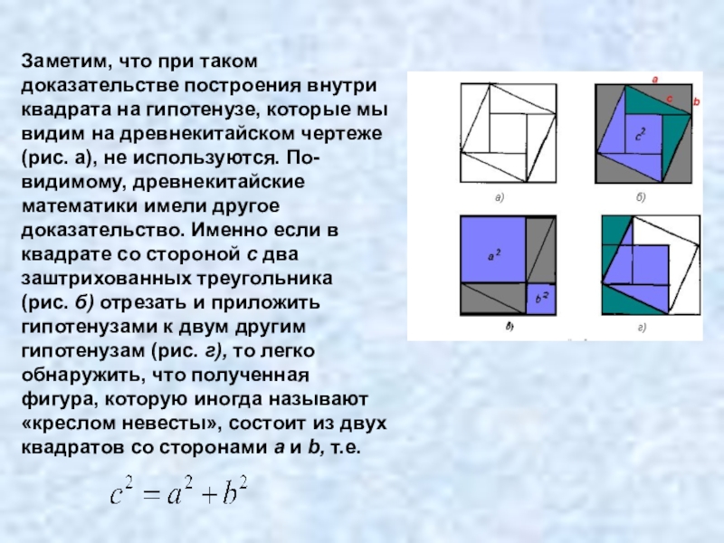 Слайд 41На рисунке квадраты, построенные на катетах, размещены ступенями один рядом с