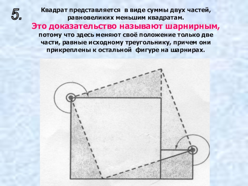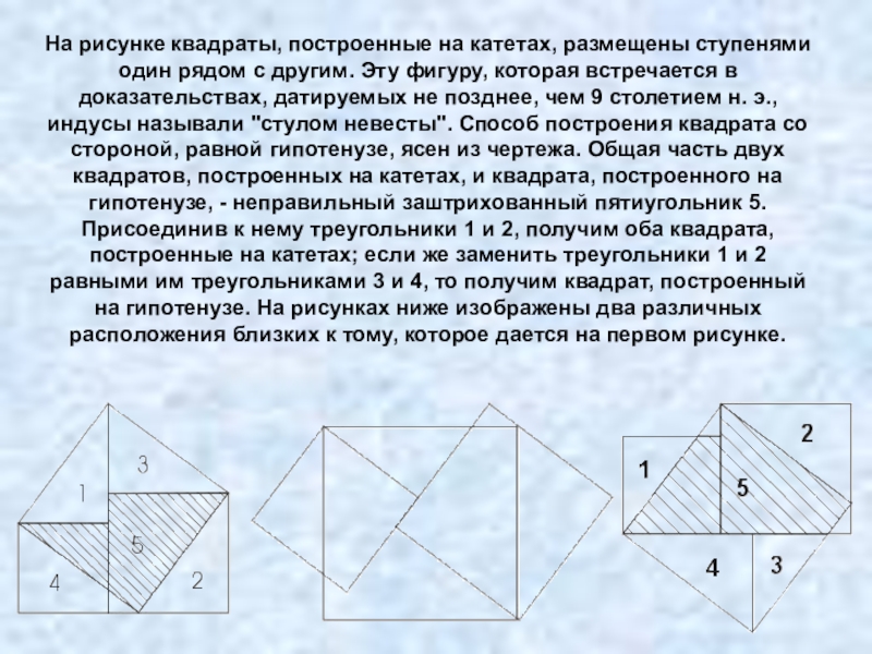 другим. Эту фигуру, которая встречается в доказательствах, датируемых не позднее, чем 9 столетием н. э., индусы называли "стулом невесты". Способ построения квадрата со стороной, равной гипотенузе, ясен из чертежа. Общая часть двух квадратов, построенных на катетах, и квадрата, построенного на гипотенузе, - неправильный заштрихованный пятиугольник 5. Присоединив к нему треугольники 1 и 2, получим оба квадрата, построенные на катетах; если же заменить треугольники 1 и 2 равными им треугольниками 3 и 4, то получим квадрат, построенный на гипотенузе. На рисунках ниже изображены два различных расположения близких к тому, которое дается на первом рисунке.