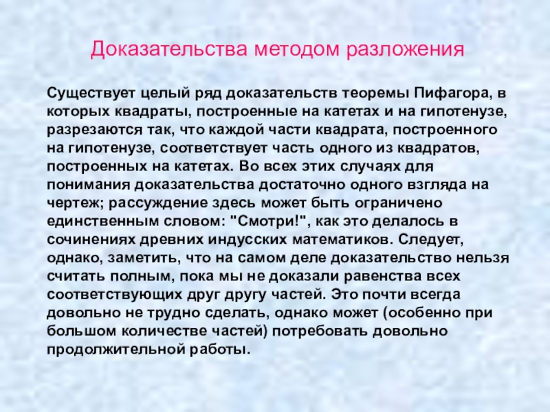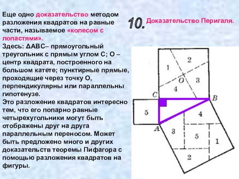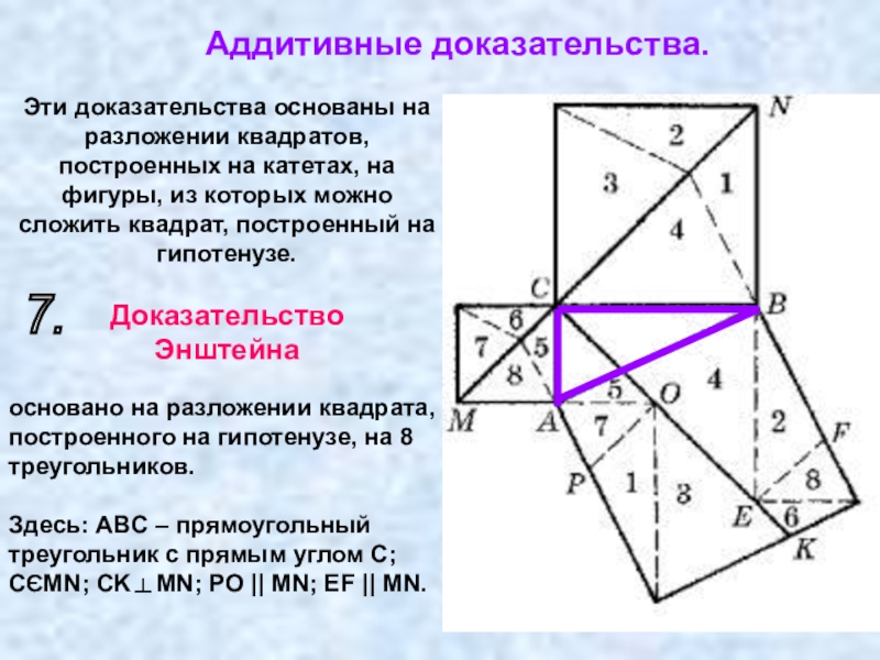 квадрат, построенный на гипотенузе, с одной стороны, и квадраты, построенные на катетах, с другой, складывались из равных частей. Такие доказательства называются доказательствами при помощи сложения ("аддитивными доказательствами") или, чаще, доказательствами методом разложения. До сих пор мы исходили из обычного расположения квадратов, построенных на соответствующих сторонах треугольника, т. е. вне треугольника. Однако во многих случаях более выгодно другое расположение квадратов.