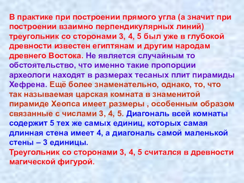 треугольник, и применяли его для определения прямых углов при восстановлении размываемых ежегодными разливами Нила границ земельных участков.