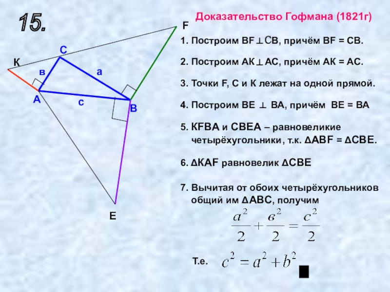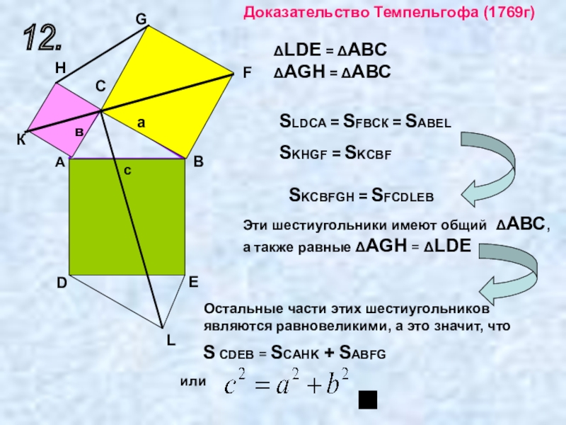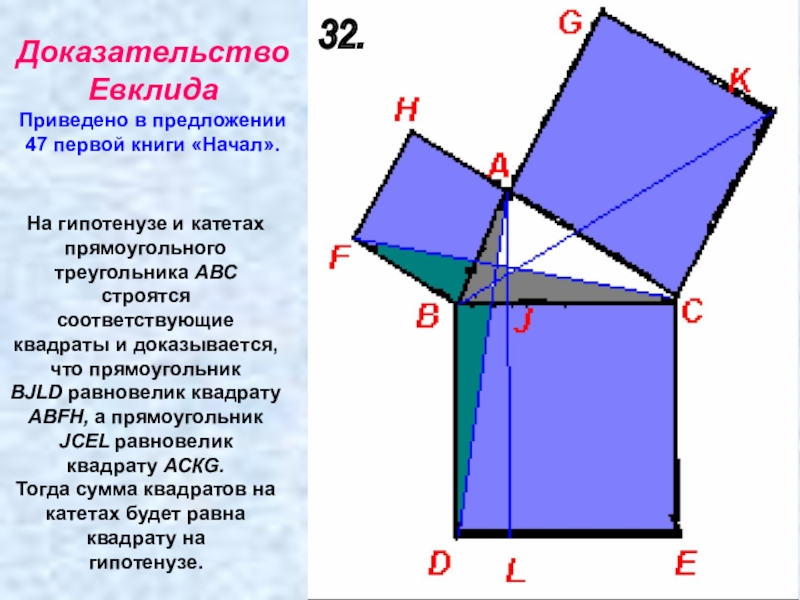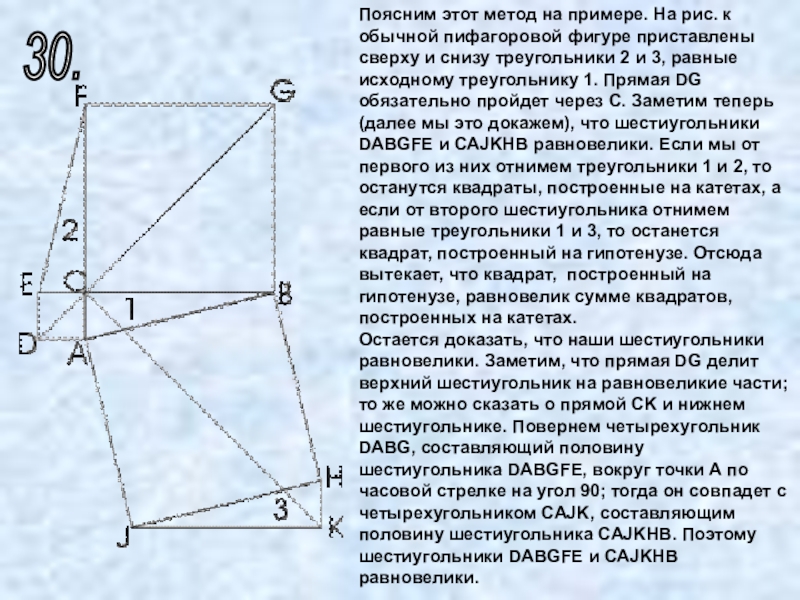 приставлены сверху и снизу треугольники 2 и 3, равные исходному треугольнику 1. Прямая DG обязательно пройдет через C. Заметим теперь (далее мы это докажем), что шестиугольники DABGFE и CAJKHB равновелики. Если мы от первого из них отнимем треугольники 1 и 2, то останутся квадраты, построенные на катетах, а если от второго шестиугольника отнимем равные треугольники 1 и 3, то останется квадрат, построенный на гипотенузе. Отсюда вытекает, что квадрат, построенный на гипотенузе, равновелик сумме квадратов, построенных на катетах.