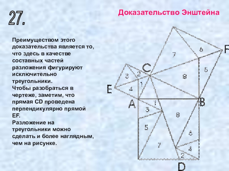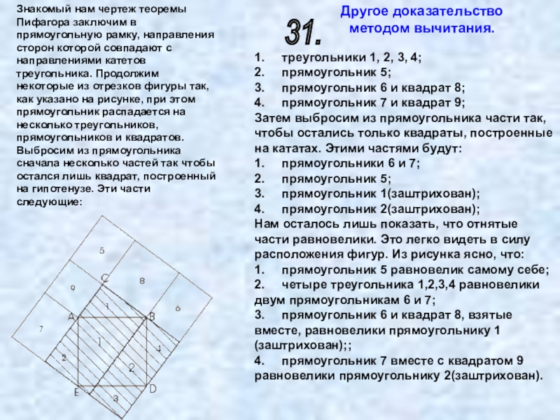 Слайд 48 Выражение площади квадрата, построенного на гипотенузе, как сумма площадей