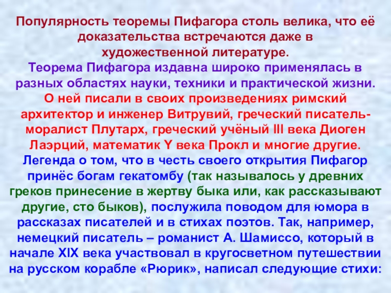 Слайд 4Популярность теоремы Пифагора столь велика, что её доказательства встречаются даже в