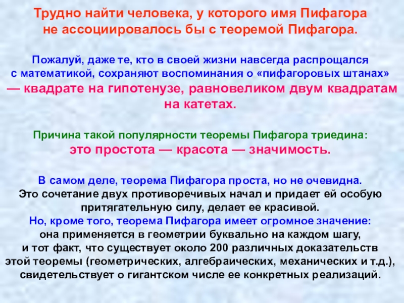 Причина такой популярности теоремы Пифагора триедина: