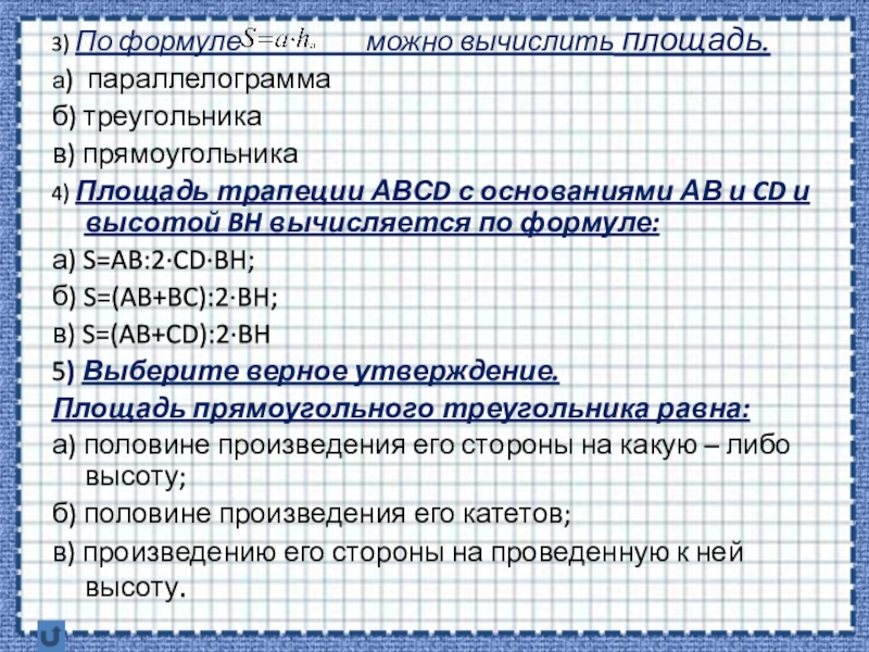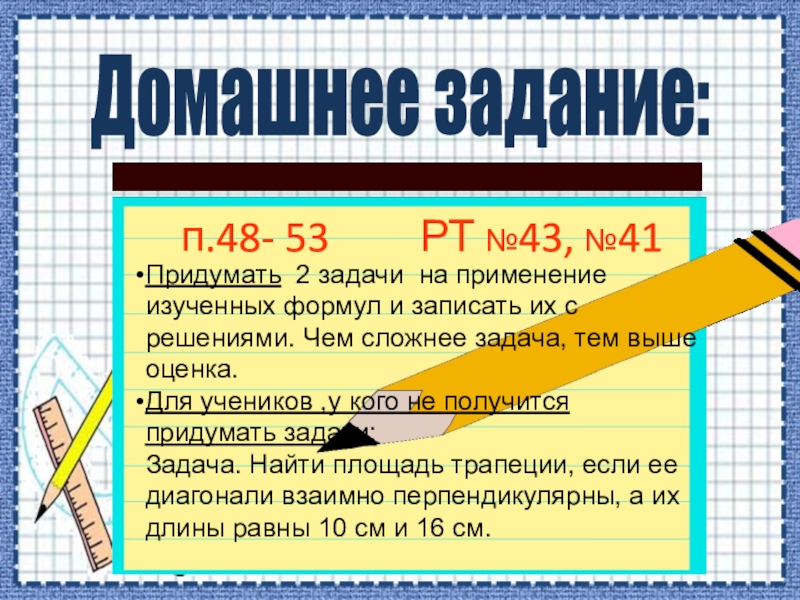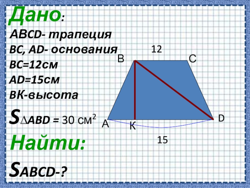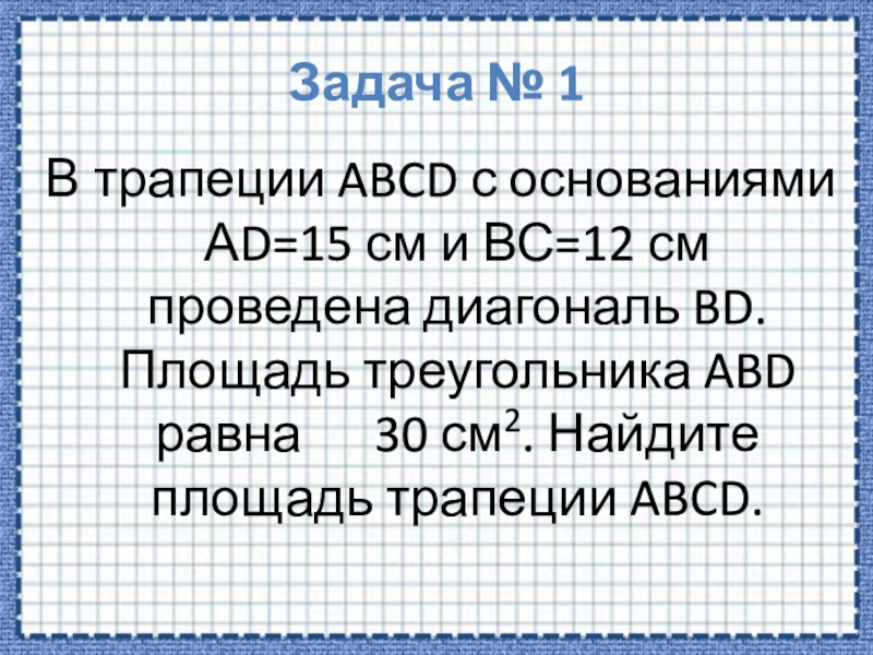 Параллельные стороны трапеции равны 6 м и 9 м, а высота трапеции 4 м. Вычислите площадь трапеции.