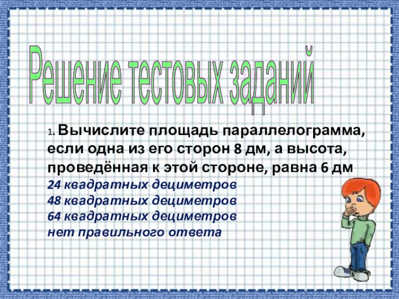 Стороны параллелограмма равны 10 дм и 6 дм, а угол между этими сторонами равен 150. Найдите площадь этого параллелограмма.