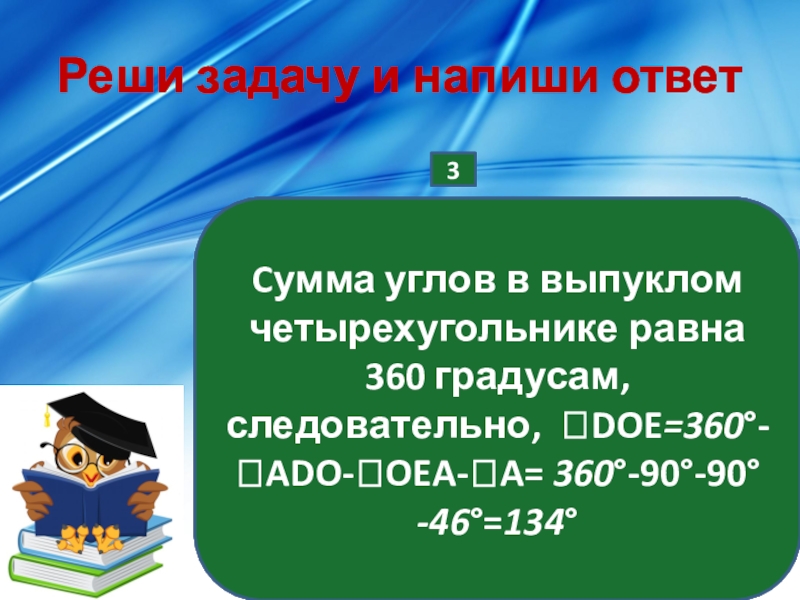 Cумма углов в выпуклом четырехугольнике равна 360 градусам, следовательно, ꓡDOE=360°-ꓡADO-ꓡOEA-ꓡA= 360°-90°-90° -46°=134°