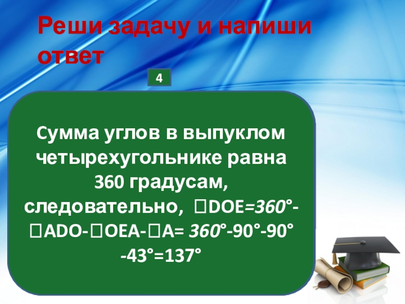 Cумма углов в выпуклом четырехугольнике равна 360 градусам, следовательно, ꓡDOE=360°-ꓡADO-ꓡOEA-ꓡA= 360°-90°-90° -43°=137°