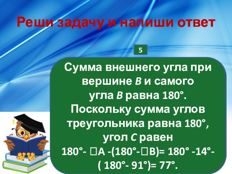 Сумма внешнего угла при вершине B и самого угла B равна 180°. Поскольку сумма углов треугольника равна 180°, угол C равен