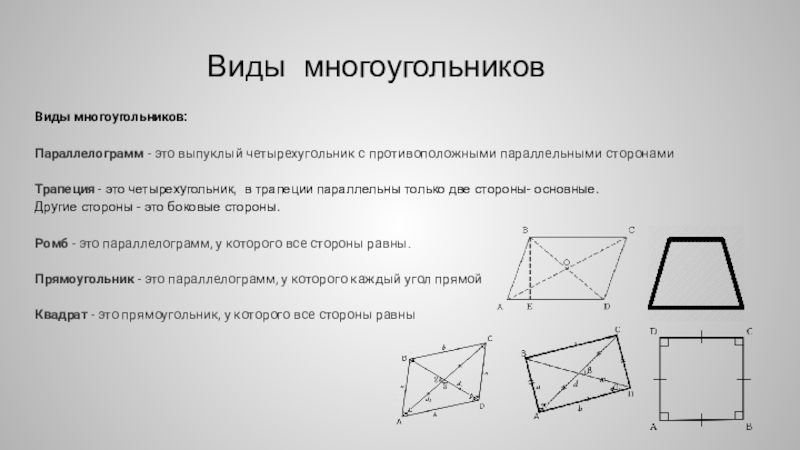 Трапеция - это четырехугольник, в трапеции параллельны только две стороны- основные. Другие стороны - это боковые стороны.