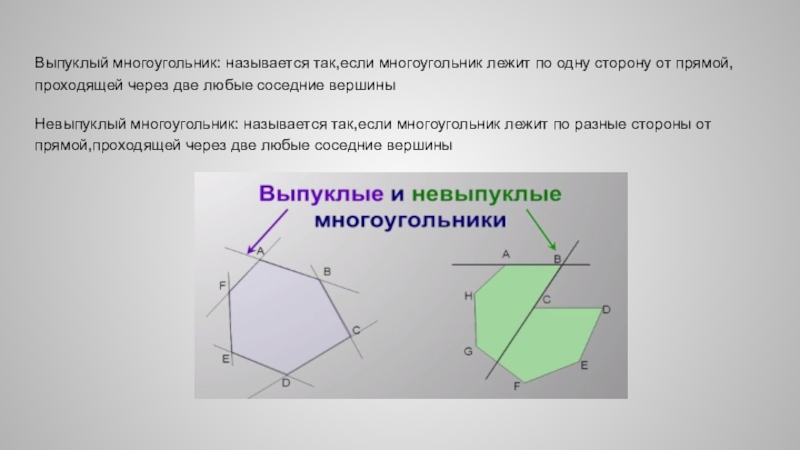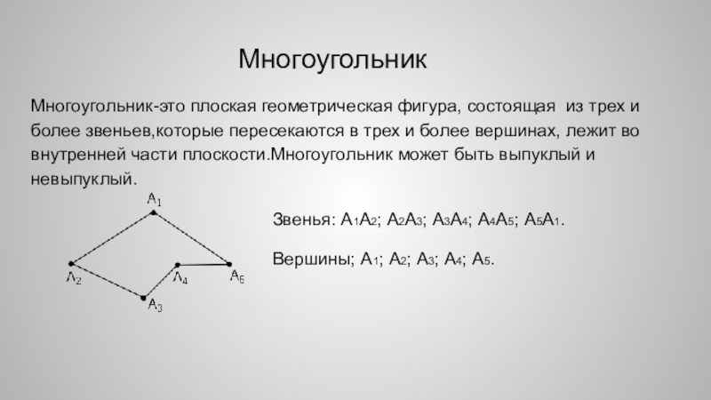Многоугольник-это плоская геометрическая фигура, состоящая из трех и более звеньев,которые пересекаются в трех и более вершинах, лежит во внутренней части плоскости.Многоугольник может быть выпуклый и невыпуклый.