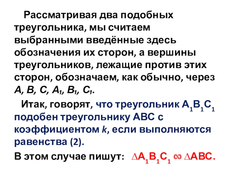 Итак, говорят, что треугольник А1В1С1 подобен треугольнику АВС с коэффициентом k, если выполняются равенства (2).