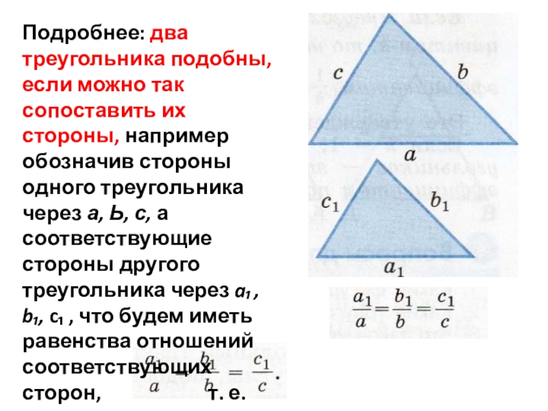 Слайд 12Подробнее: два треугольника подобны, если можно так сопоставить их стороны, например