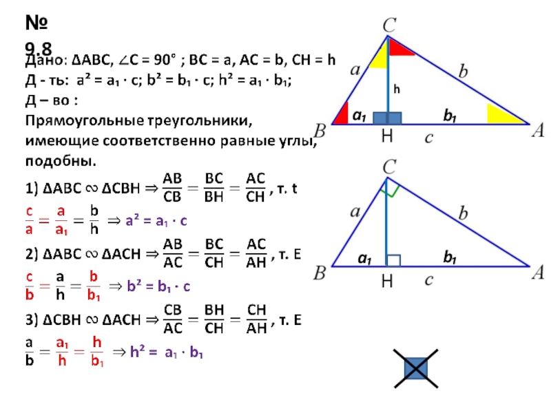 Дано: ΔАВС, ∠С = 90° и ΔА₁В₁С₁, ∠С₁ = 90°;