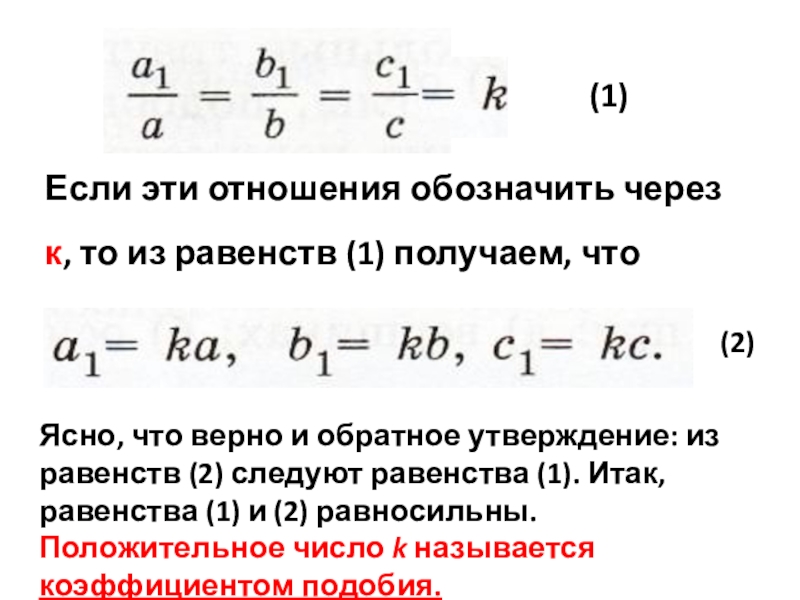 Ясно, что верно и обратное утверждение: из равенств (2) следуют равенства (1). Итак, равенства (1) и (2) равносильны. Положительное число k называется коэффициентом подобия.
